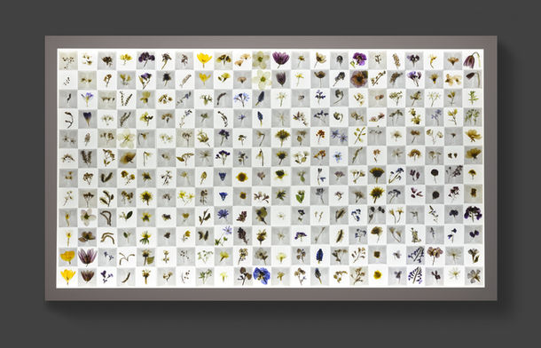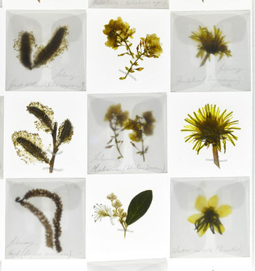 The pressed samples, collected and preserved at the peak of their bloom, are arranged chronologically in order of their flowering times, tracing the subtle choreography of plant-pollinator relationships across an entire bee year.